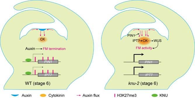 花承担着种子植物的繁殖功能。在农业领域,花的正常发育直接影响作物的产量和质量。因此,对植物花器官发育机理的研究对于提升作物产量具有现实意义。拟南芥的花由花分生组织(FM)分化产生,包括萼片、花瓣、雄蕊和雌蕊四轮花器官。在花发育的第6期,FM开始分化产生雌蕊原基,此时FM中的干细胞活性需要被适时终止,否则过量的干细胞将产生多余的花器官,使得植物育性降低或败育。C2H2型锌指蛋白KNUCKLES(KNU)是调控FM适时终止的关键转录因子之一,其在花发育的第6期通过直接破坏维持FM活性的WUSCHEL(WUS)-CLAVATA3(CLV3)反馈调节回路,终止FM活性。生长素和细胞分裂素是两类重要的植物激素,对植物各阶段的生长发育具有广泛的调控作用。在花发育过程中,植物激素生长素和细胞分裂素也参与调控FM的活性。KNU与生长素或细胞分裂素是否能相互作用并共同调控FM活性的终止,以及具体的分子调控机制有待深入解析。