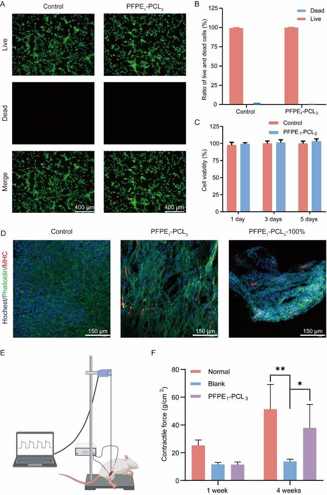 该工作创新性的过调节PFPE与PCL链段的分子间相互作用以形成自组装和微相分离结构,成功制备出一种兼具低弹性模量和超高韧性的多功能人工肌肉,可用于VML治疗和假肢驱动,为后续支架材料的发展和人工肌肉的临床应用提供了一种新方向。相关成果以“A soft, ultra-tough and multifunctional artificial muscle for volumetric muscle loss treatment”为题,发表在《National Science Review》上(DOI: 10.1093/nsr/nwae422)。博士研究生邱鹏飞和凯发k8官网医科大学附属儿童医院博士后强磊为论文共同第一作者,李承辉教授和凯发k8官网医科大学附属儿童医院郑朋飞教授为论文的共同通讯作者。该工作得到了国家自然科学基金、中央高校基础科研经费的资助。