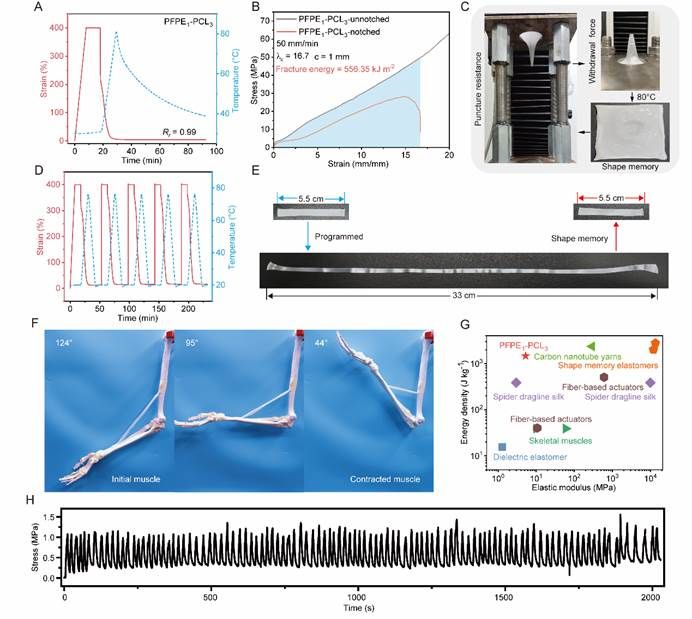 此外,该材料展现出优异的形状记忆特性与致动性能,能够在受热后迅速恢复至原始形态,具备高达600%的致动应变和1450 J/kg的致动能量密度。在热刺激下,该材料可提拉超过自身重量5000倍的物体。同时,这种人工肌肉能够在多次加热与冷却循环中,稳定实现往复的收缩和伸展动作,成功了模拟天然肌肉的致动功能,展现出在假肢驱动器领域的巨大应用潜力(图4)。