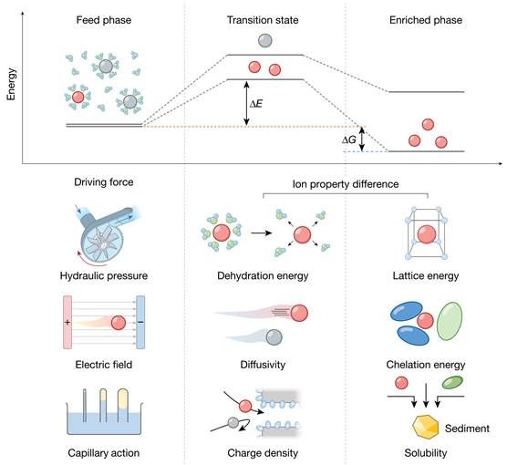 在论文的最后,作者总结了当前技术的挑战与未来的研究方向。他们指出,尽管材料创新、多级提取和多技术多资源协同提取等方案显著推进了低品质卤水锂提取技术的进步,但现阶段该领域仍然面临一些关键问题阻碍其大规模实用化,如提高提取效率、减少成本、优化操作条件等。未来的研究需要聚焦于提高提取过程的经济性、缩短生产周期,并进一步降低环境影响。同时,作者从分离过程中的原液(初始态)、中间相(过渡态)和浓缩液(最终态)三个状态出发,系统剖析了各个技术路线中实现离子分离所利用的包括驱动力、脱水能、晶格能、扩散速率等不同机制,阐述了锂元素与干扰离子的分离原理和方法策略,提出了锂离子分离的驱动力(表面张力、热蒸腾、电场力、机械水压、化学势差等)和能级差理论,为后续新型锂提取技术的开发提供了新的思路。