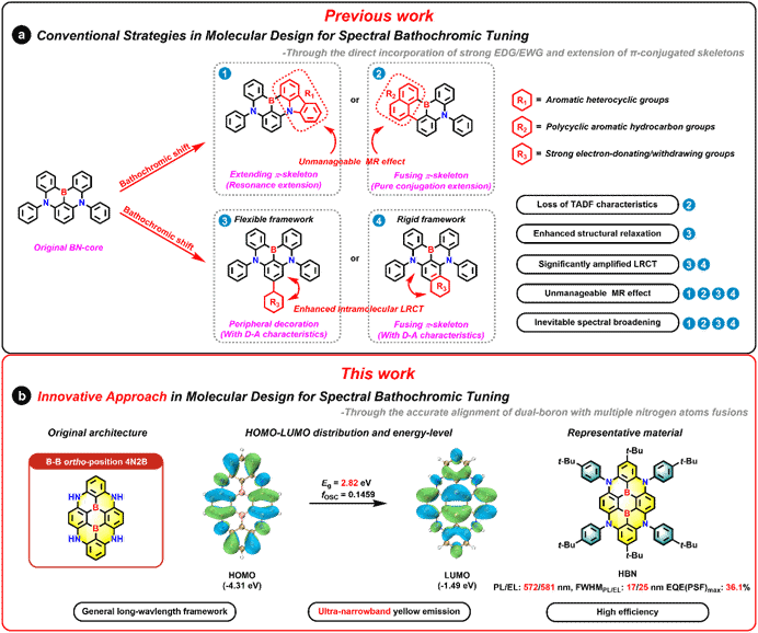 用于超高清显示技术的有机发光二极管(UHD-OLED)对其发光材料的光谱宽度需求由较高要求,光谱窄化这一技术瓶颈的解决是满足广色域(BT.2020)行业显示标准的关键,并可以借此显著提升终端显示效果。窄带多重共振型热激活延迟荧光(MR-TADF)材料作为当前显示终端材料端口的高效解决方案,在过去十年间取得了显著进展。尽管现有大多数MR-TADF材料能够实现一定程度的窄带发射(半峰宽FWHM< 50 nm),但能够实现FWHM小于20 nm的超窄带发射的材料仍属罕见,且这些材料几乎仅限于蓝光至绿光区域,难以覆盖长波长范围。此外,超窄带长波长发光材料领域缺乏高性能的分子设计框架,因此,如何同时实现光谱窄化与红移已成为学术界和工业界亟待突破的核心难题。