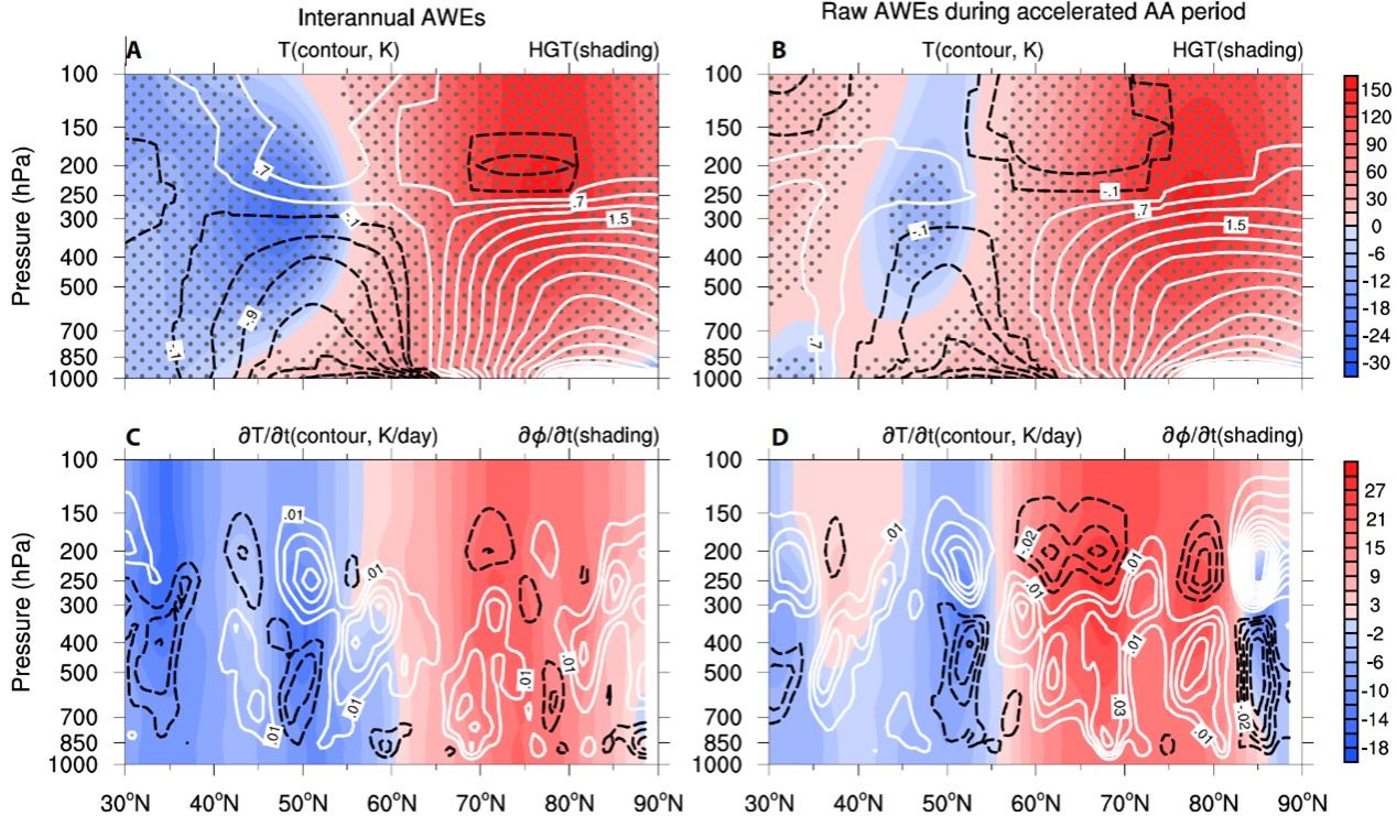 图3 冬季北极变暖通过减弱天气涡旋活动及其向平均流的非线性反馈导致欧亚中高纬位势高度异常和气温异常的经向偶极型空间分布。(A)1981-2022期间最强300个年际尺度北极暖事件(AWE)合成、滞后这些暖事件1-3天平均、并沿着欧亚扇面(30oE-120oE)平均的位势高度异常(填色)和气温异常(等值线)的纬度-高度剖面图;(B)同(A),但为北极加速变暖期间(2002-2022)最强300个原始北极暖事件(AWE)合成。(C, D) 同 (A, B), 但为合成的滞后北极暖事件1-3天平均的天气涡旋涡度强迫异常引起的平均位势倾向异常(填色)和平均气温倾向异常(等值线)。