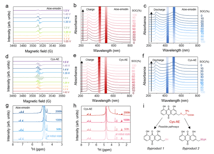 随后,研究团队研究了Cys-AE在水溶液中的解离行为,并结合DFT理论计算研究了Cys-AE的氧化还原行为。与天然氨基酸类似,Cys-AE 分子可通过两性解离平衡显著增强其水溶性。此外,通过与溶剂和对离子之间的竞争性相互作用,这些溶解性基团在蒽醌主骨上的不对称分布进一步提升了其最大溶解度。进一步研究发现,Cys-AE 通过 Nafion-212 膜的渗透率低于 1 × 10??? cm?/s,能够有效避免电解液穿膜污染。为深入理解 Cys-AE 的分子结构与性能之间的关系,研究人员结合紫外可见光谱(UV-Vis)、核磁共振(NMR)、电子顺磁共振(EPR)等多种手段分析了其电子结构和稳定性。TDDFT 计算结果显示,Cys-AE 分子中的电子云密度主要分布在蒽醌主骨上,而引入的半胱氨酸侧链提升了溶剂化能力和空间阻碍作用,有效抑制分子间聚集及穿膜扩散。