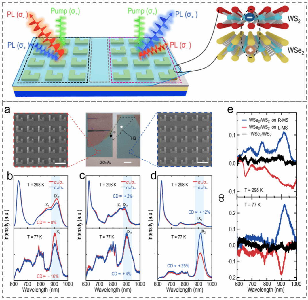图1.构建双手性超构表面增强二维材料异质结中层间激子谷极化的实现方案示意(上图);双手性超构表面的扫描电子显微镜照片以及实验测量得到的温度为298K和77K情形下集成了双手性超构表面的WS2/WSe2异质结样品的光致发光谱和圆二色性谱(下图)。