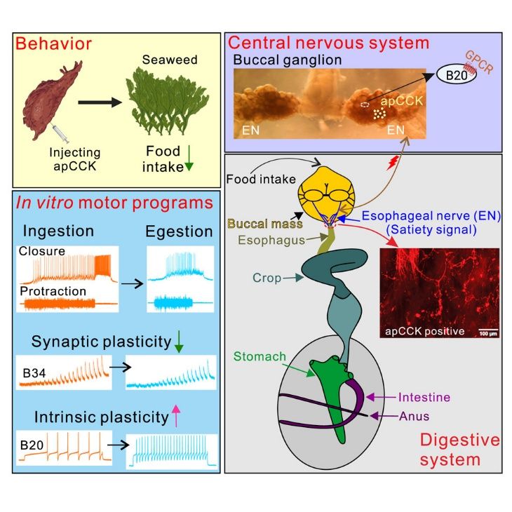 本研究团队以软体动物海兔(Aplysia)为模式动物,依托其已明确的摄食神经环路,结合分子生物学、质谱、行为学、细胞生物学及神经电生理等多学科技术,取得了以下三项突破: