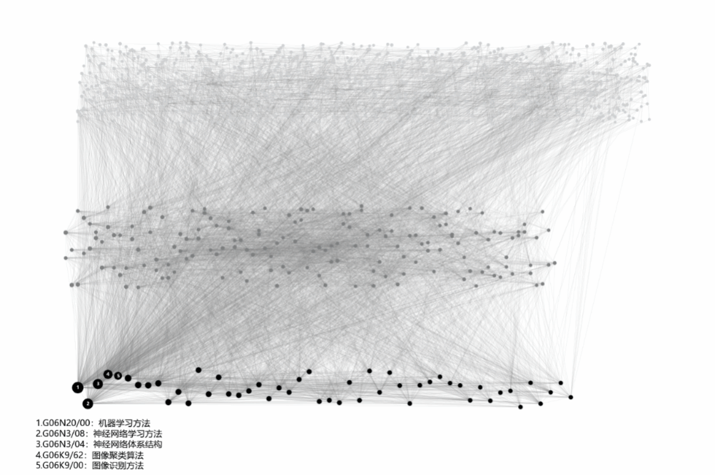 对AI知识网络的K核分解可视化如图3所示:提取出最深核心(K=23核)知识网络并以Kamada-Kawai力学布局方式可视化,呈现出以机器学习(G06N20/00)为核心枢纽,神经网络、图像聚类等技术强耦合的“底层算法集群”。图谱清晰显示AI知识不是孤立存在,而是嵌套关联的高度集成系统,底层算法正是连接通用智能各模块的关键引擎。