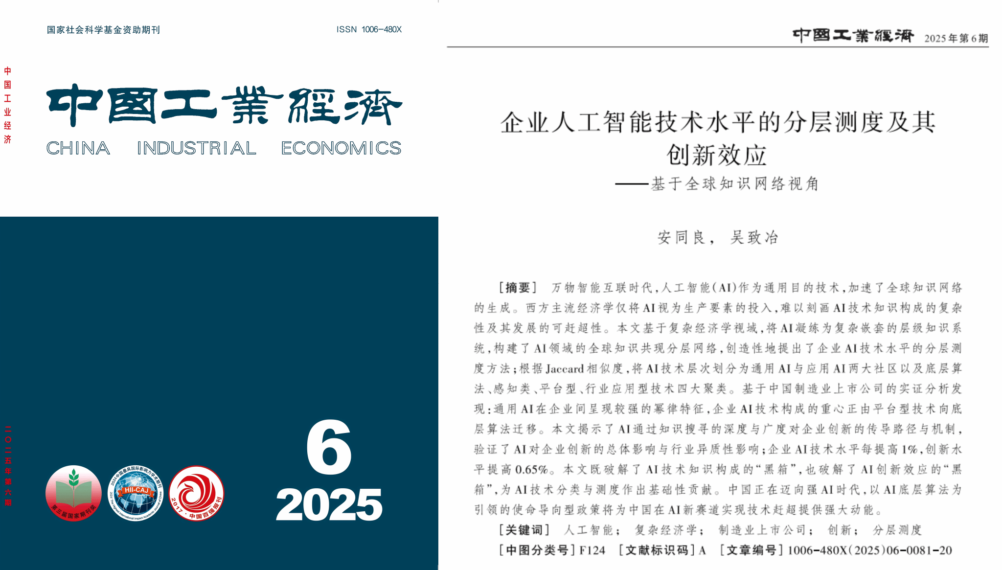 近日,我校安同良教授和博士生吴致冶在经济学顶刊《中国工业经济》(2025年第6期)发表了题为“企业人工智能技术水平的分层测度及其创新效应-基于全球知识网络视角”的研究论文。