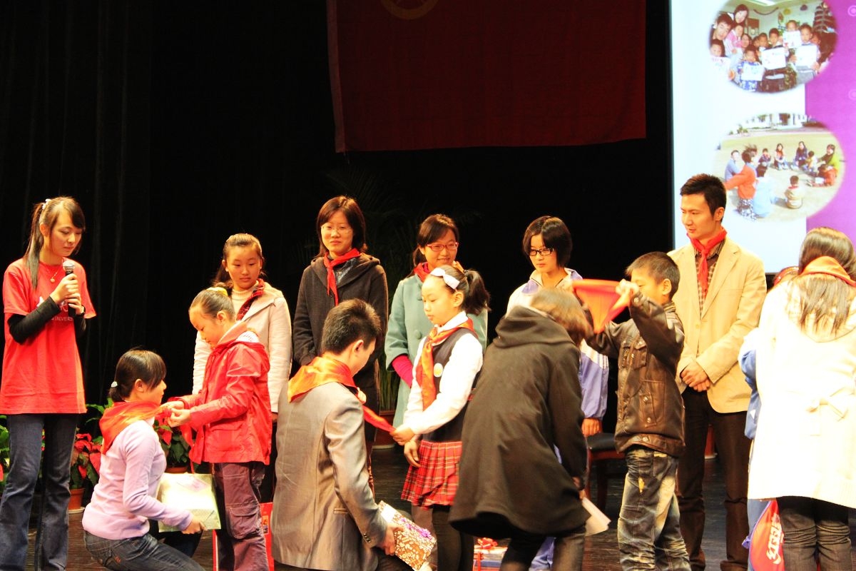 在团日活动上,计算机系“沙枣花再绽放”暑期社会实践团队、法学院学生法律援助中心、计算机系暑期赴南非服务的志愿者分别以视频的形式向新同学们介绍了他们的志愿服务经历。在全场观众齐唱“沙枣花再绽放”团队手语队歌的环节后,凯发k8官网团市委与 我校团委共同启动了“同城有爱 快乐成长”农民工子弟夏令营计划,团市委副书记郑玲玲为我校团委授牌“凯发k8官网市志愿服务基地”,来自凯发k8官网市9所农民工子弟学校的中小学生代表也来到台上,与我校9个基层院系的团委举行了简短的结对仪式,孩子们为团委老师们戴上了红领巾,老师们则给孩子们带来了自己的爱心礼物,活动现场掀起了第一轮高潮。
