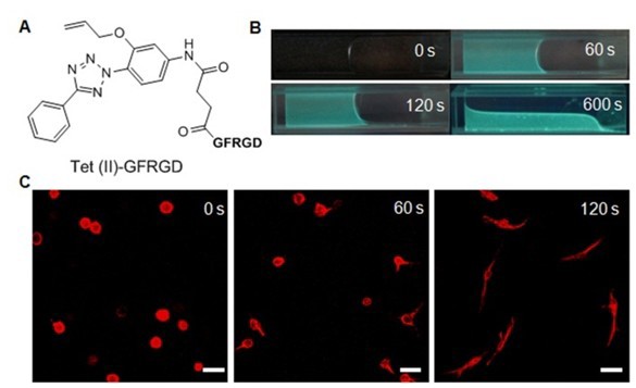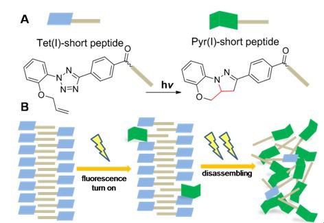 化学化工学院张艳教授课题组围绕光活性分子的反应和应用开展了多学科交叉的研究工作,最近在基于光活性分子的化学生物学研究取得了重要进展。该课题组近期在J. Am. Chem. Soc.上报导了一例基于光活性分子修饰的新型短肽光敏性超分子水凝胶(J. Am. Chem. Soc. 2013, 135, 18718-18721),在这项工作中,作者巧妙地使用一个可以在温和的光照条件下发生快速的分子内“光点击”反应的二芳基取代四氮唑分子作为“光扳机”。将此“光扳机”修饰在合成短肽的氮端,可以促使合成短肽分子在生物相容的环境下通过自组装形成机械性能很好的超分子水凝胶,该水凝胶在温和的光照条件下可被“光扳机”的迅速反应扰动,开启荧光发射及水凝胶的光降解等智能响应(图1)。