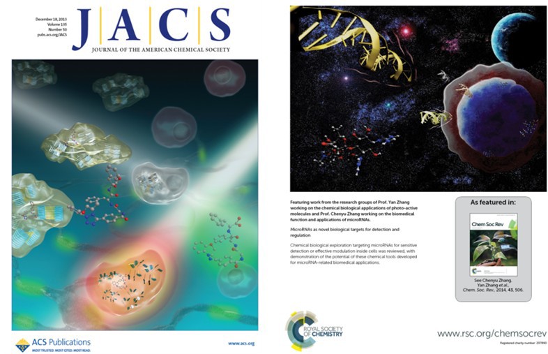 此外,该课题组还通过与我校生命科学院张辰宇教授研究团队的合作,积极探索由光活性分子的反应获取的新结构化合物在调控细胞内microRNA这一前沿研究方向上的应用。目前他们已经从基于光活性分子反应的新结构化合物中筛选得到了几类有重要调控活性的化学小分子。基于这些活性小分子构建探针开展的化学生物学研究也属于目前该领域研究的前沿,张艳教授和张辰宇教授就microRNA作为新型生物靶标的化学生物学研究撰写的综述也作为2014年第二期的封底(图3右)发表于颇具影响力的化学综述杂志 ( Chem. Soc. Rev. 2014, 43, 506-517)。