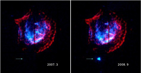 图1:图片中间展示的是银河系内的超新星遗迹“Kes79”,蓝色显示X射线辐射,红色显示射电辐射。在图片的下侧,右图箭头所指的蓝色光斑是新发现的暂现X射线强磁脉冲星,它在2008年的观测中赫然出现,而在左图显示的2007年的观测中不见踪影。在靠近图片中心的地方,还有另一颗称为“中央致密天体”的中子星。图片上的缝隙是望远镜的探测器留下的。