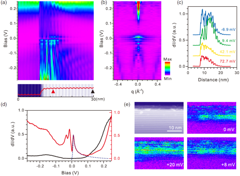 图二:(a) 在ZrTe5表面台阶处测量的微分电导(局域态密度);(b) 图(a)的快速傅立叶变换结果;(c) 边界态在不同能量位置的穿透深度;(d) 体相(黑色)和边界处(红色)的局域态密度比较;(e) 边界态沿着表面台阶分布的一维性质。