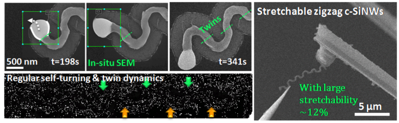 凯发k8官网电子科学与工程学院余林蔚教授课题组,通过与北京大学和巴黎综合理工大学的合作,首次发现了一种平面限制的自发Zigzag振荡晶硅纳米线生长模式,可在大面积低温硅基薄膜工艺所兼容的条件下(<350 oC),不需要任何外界实时干预,通过自组装生长制备周期晶硅二维纳米线弹簧(nanowire spring)结构;由于平面纳米线生长不需要提供生长气氛,在原位扫描电子显微镜(SEM)中可以直接观测其丰富的动态生长过程,为探索期独特的生长机理提供了关键支持。结合系统的晶格结构分析,此工作还揭示了其中独特的自发“晶向降序偏转和孪晶反射”生长过程,并建立了一套较为完善的生长描述和调控理论模型。更为重要的是,在拉伸应力(stress-strain)测试中,此类晶硅纳米线弹簧结构的确展示出了大幅提高的可拉伸特性(>12%),这为进一步性能提高确定了方向。此研究结果为实现新一代高迁移率、高稳定性可拉伸纳米线器件指示了一条全新的形貌调控和制备策略,并有望将成熟的晶硅电子技术拓展到全新的柔性可拉伸电子领域,推动可穿戴电子应用的新思路和新方向。