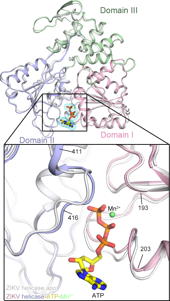 该科研团队利用X光单晶衍射技术,在原子分辨率水平解析了寨卡病毒解旋酶、三磷酸腺苷(ATP)和金属催化离子形成的三元复合物的空间结构。在研究过程中,他们成功捕捉到了寨卡病毒解旋酶结合ATP以及金属离子的中间态。这也是首次捕捉到黄病毒属(包括登革热病毒、黄热病毒、西尼罗病毒等)的解旋酶结合其天然底物ATP的中间体。通过对这一精细结构的分析,联合科研团队揭示了寨卡病毒解旋酶如何识别ATP和金属催化离子的精确机制。