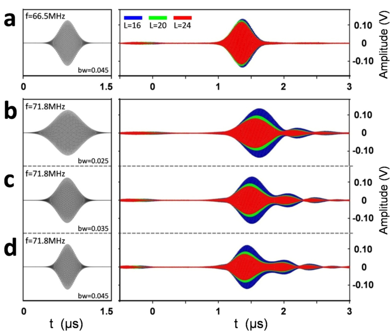图-3 (a)偏离狄拉克频率的声表面波高斯脉冲的时域透射信号。 (b)(c)(d)狄拉克频率(71.8MHz)处声表面波高斯脉冲的时域透射信号,声表面波脉冲波包显示为明显的指数衰减振荡。