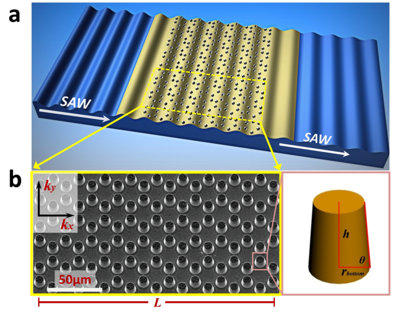 图-1 (a)声表面波体系人工声学二维材料——表面声波类石墨烯微结构材料的示意图。(b)电子显微镜照片:在压电材料铌酸锂(LiNbO3)基底表面,采用电化学生长的微结构蜂窝状镍(Ni)柱阵列。