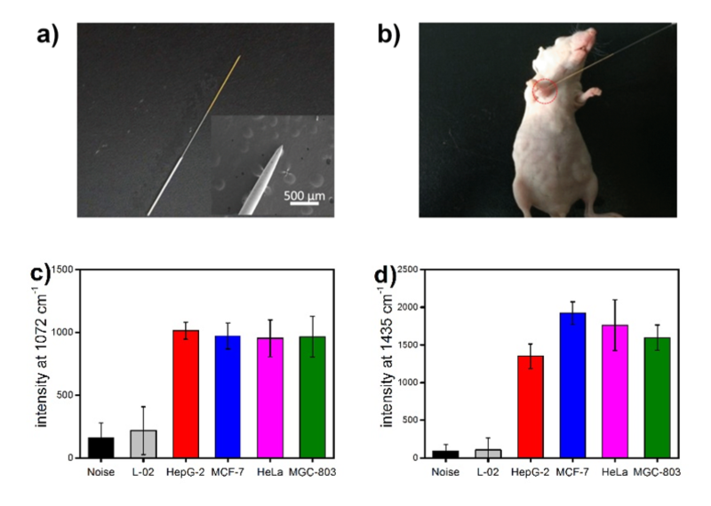 图3. 基于针灸针萃取探针(a)的表面等离激元免疫夹心法检测种植了不同细胞的小鼠(b)内碱性磷酸酶(c)及survivin (d)
