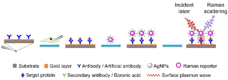 图1. 表面等离激元免疫夹心法的单细胞分析原理示意图
