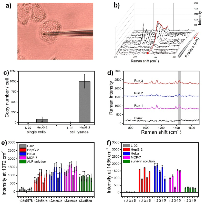图2. 单细胞活体微萃取示意图(a)、单细胞内碱性磷酸酶的空间分布(b)、单细胞分析结果和细胞裂解液分析结果比较(c)、检测正常肝细胞内6个survivin分子所得拉曼信号(d)及不同细胞系中碱性磷酸酶(e)及survivin(f)的分析结果对照