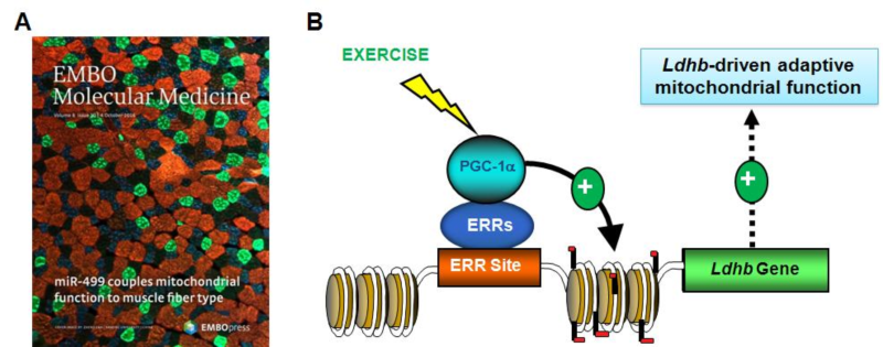 甘振继研究组在近期研究中,揭示了一个miR-499/Fnip1/AMPK通路,为骨骼肌线粒体功能与肌纤维收缩精准偶联提供了完美的解释(Liuet al,EMBO Mol Med, 2016),文章被推荐为《EMBO分子医学》10月份期刊封面故事(图A)。该研究组进一步研究这一通路下游发现,人体运动可以激活乳酸脱氢酶LDHB基因的表达。LDHB基因表达水平在运动员肌肉中明显高于常人,并且在同一个体的运动前后也发生了显著变化。此外,LDHB基因表达水平还与人体肌肉运动前后的pH变化呈显著负相关关系。这些结果提示LDHB可能是运动锻炼骨骼肌代谢重塑的重要通路。我们利用系列小鼠细胞分子实验,揭示了运动锻炼通过激活PGC-1a/ERR结合到Ldhb基因启动子上非常保守的ERR应答元件上来调控Ldhb的表达。为了研究Ldhb基因的运动代谢生理功能,我们构建了骨骼肌特异性的Ldhb转基因小鼠,发现激活Ldhb可以显著提高小鼠运动过程的耗氧能力,增强小鼠的运动耐力;这些作用很可能依赖于Ldhb过表达引起的骨骼肌线粒体代谢功能增强;进一步的体外分子细胞研究结果确证了激活Ldhb可增强线粒体氧化代谢功能。这项研究揭示了一个运动锻炼通过PGC-1a/Ldhb通路改善骨骼肌线粒体功能的分子机制(图B),为探讨肌肉线粒体代谢相关疾病的防治新途径提供实验依据。