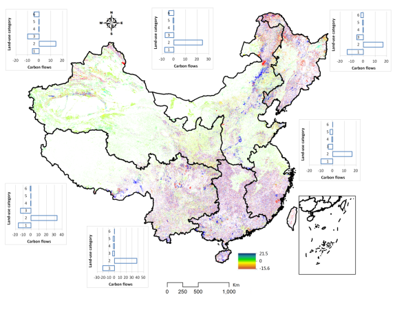 本研究是对该领域的进一步深化,研究中以1 km-Grid 土地利用栅格数据为基础,配合气候带类型图、植被分布图和土壤类型等辅助图层、以及大量国内陆地生态系统碳循环的研究参数成果、并借鉴2006IPCC(Intergovernmental Panel on Climate Change)清单中主要土地利用类型(农田、草地、森林)不同管理方式下碳储量变化影响因子,首次综合评价了近20年来中国土地利用类型变化及土地管理方式变化对陆地生态系统碳储量的影响。研究发现,1990-2010年期间,土地利用类型及管理方式变化共造成我国陆地生态系统1.45PgC T 的碳储量损失。其中,土地利用类型变化使我国植被碳储量增加了13.2TgC yr-1,而土壤有机碳含量减少了11.5TgC yr-1;土地利用方式转变尤其是建设用地的快速增长共造成101.8TgC yr-1的碳损失。该研究对我国陆地生态系统碳平衡进行了全面检验,能为转变土地利用方式,促进低碳发展提供决策参考和技术支撑。