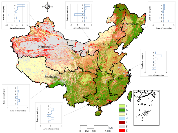 图 (a) 1990-2010年中国土地利用类型变化 (字母a-f分别代表耕地、林地、草地、水域、建设用地和未利用地); 图 (b) 1990-2010年中国土地利用类型变化对的碳储量的影响(1-6分别代表耕地、林地、草地、水域、建设用地和未利用地变化导致的碳储量变化); 图 (c) 1990-2010年中国土地管理造成的碳储量变化 (1-3分别代表林地管理、农地管理和草地管理导致的碳储量变化)