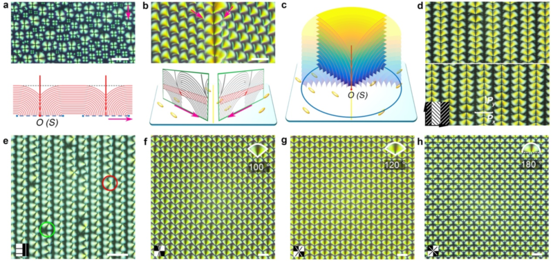 我校胡伟、陆延青团队创造性地将动态掩模光取向技术引入近晶相液晶超结构控制,将“自上而下”的图案化取向与“自下而上”的液晶分子组装相结合,证实了上述分子层“折纸术”的设想。首先,引入两个相邻±45°取向的区域,在各自区域内,缺陷线倒向取向方向,形成扇形的square FCDs(SFCDs);但在边界区域,相邻的分子层连接形成半圆形畴(图1b)。这是由于在两侧取向的方向上,液晶分子受取向剂表面锚泊力的影响,沿该方向排列,而另外一半由于与表面取向发生冲突而受到抑制,最终只生成半个TFCD(图1c)。这打破了传统TFCD的旋转对称性,进而引入了形状和方向两个全新的几何维度。当引入周期交替的±45°取向时,可诱导出朝向完全相反的半环面焦锥畴阵列,由于要满足与取向层方向吻合,两种情形会错开半个周期(图1d)。当相邻取向方向变为0°和90°时,半环面焦锥畴阵列的朝向变为±45°,由于此时取向对两种情况均不违背,两者出现在同一列中,由3/4 TFCD或垂面区连接(图1e)。在6 μm到 16 μm的周期范围内,畴的大小完全由预设的取向周期控制;当超过此范围,同一周期内会产生新的SFCD;而小于此范围,液晶层能接受到相邻取向区的影响,造成缺陷线偏向平均取向方向,也形成类似SFCD的畴。当进一步引入二维棋盘格形状的二元取向,并使相邻区域的取向角度从±15°变化到±45°, 研究人员获得了内角从100°到180°的不同Fragmented TFCDs(图1f-h)。这说明近晶相液晶焦锥畴的任何几何要素(大小、形状、方向、倾角)都可以通过合理的预设取向方向和图形来进行合理的控制;另外,由于每个畴的缺陷点精确坐落于取向边界的交叉点上,这使得精确操控畴的位置排列成为可能。