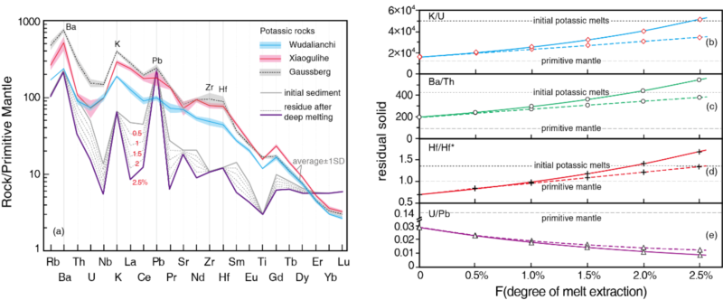 利用主微量元素和Sr-Nd-Pb-Hf-Mg同位素联合示踪的方法,发现东北钾质玄武岩的EM1端元具有偏轻的Mg同位素组成,异常高的K/U和Ba/Th比值,极低的206Pb/204Pb和U/Pb比值,以及Zr、Hf的正异常。轻的Mg同位素和极低的206Pb/204Pb比值明确支持EM1端元为再循环古老沉积物的观点。异常高的K/U和Ba/Th比值说明K-U和Ba-Th这两个地球化学行为极为相近的元素对发生了显著的分馏,且其分馏程度远超沉积物。实验岩石学研究已证明含碳酸盐的沉积物俯冲到地幔过渡带深度(410~660公里)时将发生低程度熔融并生成碳酸岩熔体,而源区钾锰钡矿和镁铁榴石的残留会导致上述元素对的显著分馏(图1)。同时,碳酸岩熔体的抽取会降低残留物的稀土元素含量,从而生成具有Zr、Hf正异常的EM1组分。因此,异常高的K/U、Ba/Th比值和Zr、Hf的正异常是东北钾质玄武岩源区EM1组分来自地幔过渡带的诊断性地球化学指标,这些指标的识别明确了钾质玄武岩与地幔过渡带物质之间的成因联系(图2)。