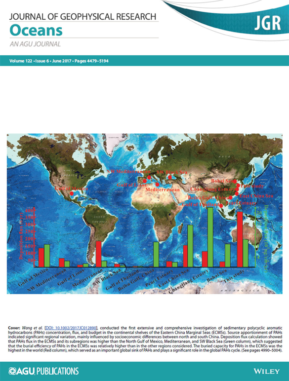 凯发k8官网地理与海洋科学学院、海岸与海岛开发教育部重点实验室的邹欣庆教授课题组有关我国近海环境中多环芳烃(PAHs)环境行为方面的研究获得重要进展,相关成果以“Distribution pattern and mass budget of sedimentary polycyclic aromatic hydrocarbons in shelf areas of the Eastern China Marginal Seas”为题,以封面论文形式(图1)发表在著名地学综合性刊物《Journal of Geophysical Research: Oceans》上(J. Geophys. Res. Ocean. (2017).122, (6): 4990-5004.)。该论文的第一作者为凯发k8官网地理与海洋科学学院2017级博士研究生王成龙,通讯作者为邹欣庆教授。
