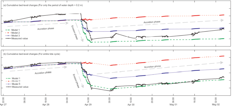 近年来,凯发k8官网地理与海洋科学学院、凯发k8官网海岸与海岛开发教育部重点实验室科研人员,组建了现代化的近底边界层观测系统(图1),在南黄海潮滩海岸(图2)进行长期观测,定量研究极浅水环境的水动力和地貌演化过程,在极浅水沉积环境中的沉积地貌方面取得若干新认识。(1)水深 < 0.2m的极浅水阶段,其持续时间仅占整个潮周期的11%,但在极浅水阶段产生的侵蚀淤积厚度占整个潮周期地貌变化的35%,表明传统观测中经常被忽略的极浅水效应在沉积地貌演化中是非常关键的;(2)在极浅水环境的海底冲淤演化模拟中,只有考虑极浅水阶段的冲淤时,计算结果才能跟实测值相吻合(图3);(3)极浅水阶段的沉积动力过程与微地貌(如沙纹)之间存在相互反馈关系,有助于加深微地貌形成和消亡机制的认识和理解。该项研究表明,在潮汐海岸环境中,考虑极浅水效应可提高海岸地貌演化的预测精度。此项研究是河口海岸演化新模式和新理论的有益补充。