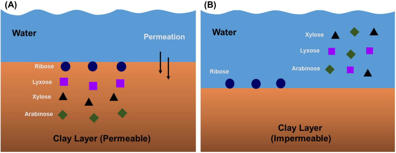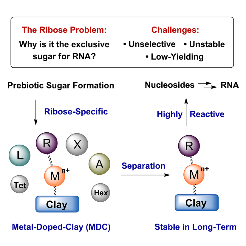 近日,凯发k8官网化学化工学院王晓课题组报道了一种更为普适的新假说,提出并证明了含有金属离子的黏土物质(Metal-Doped-Clay; MDC)可以促成核糖的自然选择。作者最初受到现代糖分析技术的启发,考察了各种单糖在离子色谱或配体交换色谱中的保留行为,发现核糖具有异于其它所有单糖的保留时间。在对大量文献数据进行元分析后,作者推测:(1)核糖的自然选择很有可能由分离过程决定,而不是化学过程;(2)决定核糖这一特殊性质的,可能是它和金属离子间较强的配位作用。由这一猜想出发,作者构想了一类史前化学模型:遍布地壳的黏土物质及其吸附(或交换)的金属离子,可以作为一个"天然固定相",将核糖从混合糖中分离出来。
