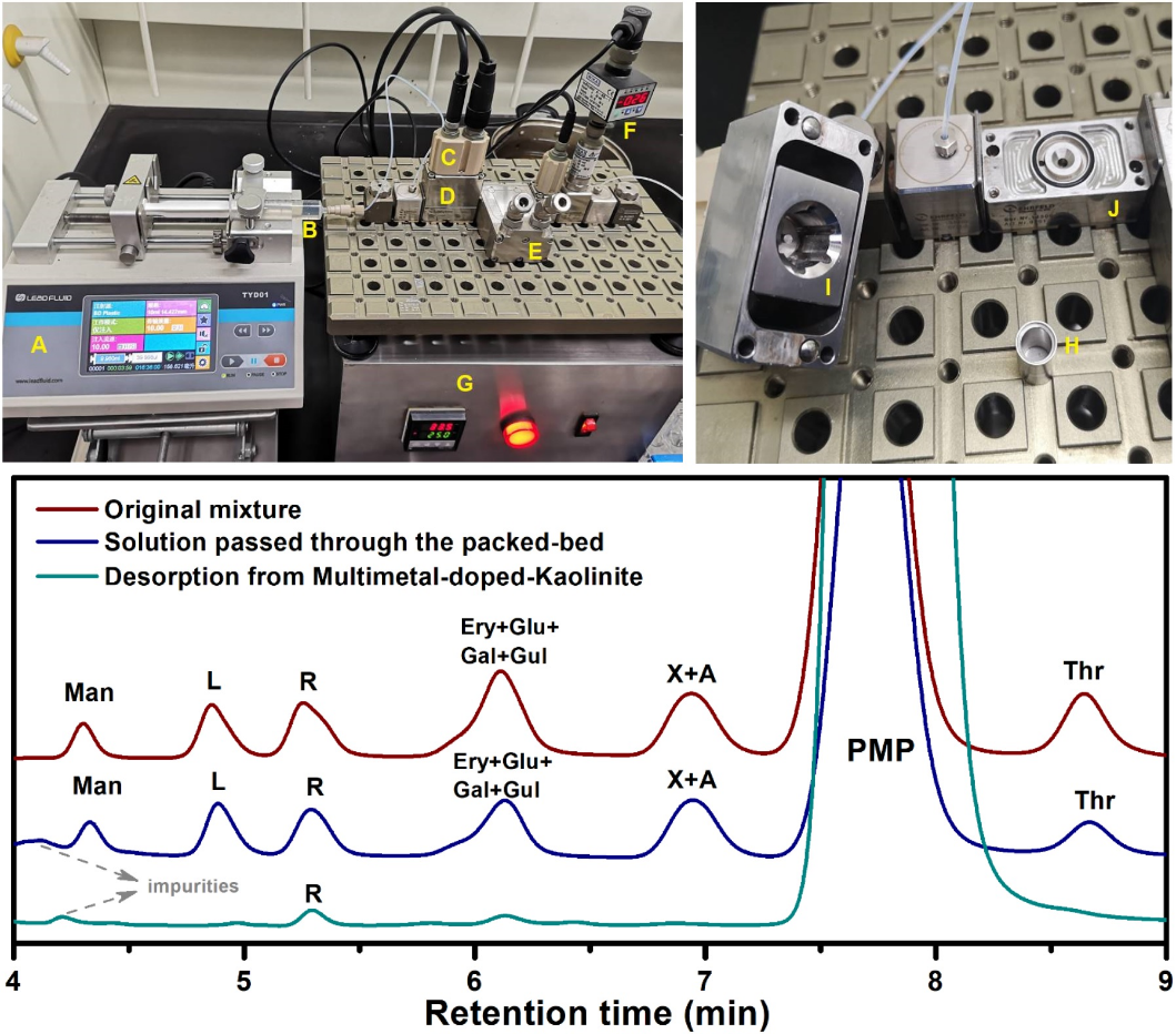 在实验阶段,作者制备了吸附有二价铁或铜离子的高岭土,发现其对于核糖(R)显示出优异的选择性吸附,而不易吸附其它三种五碳糖(A、L、X)。随后测试了多种黏土(高岭土、蒙脱石、云母)和金属离子(铁、铜、钙、镁、锰)的组合,发现绝大多数MDC对R都存在选择性吸附。除五碳糖外,对于含有十种C4–C6单糖的混合物,R依然是富集在MDC上最多的糖。为模拟MDC在水流中动态吸附核糖的行为,作者采用了模块化的连续流微反应系统,将MDC填充在固定床微反应器中。流动化学实验表明,MDC在动态的水流下对R有着极高的选择性、极快的吸附速率和很高的吸附容量。此外,作者用密度泛函理论(DFT)计算模拟了四种五碳糖和MDC的配合物,阐明了核糖和MDC结合的特殊稳定性。