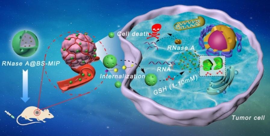 蛋白质疗法是指基于外源蛋白质或多肽等生物分子而实现细胞生物学功能的调控、疾病的治疗等作用。相比于基因/化学治疗,蛋白质疗法不会引起永久性的基因改变和严重的不良反应。这样,蛋白质疗法在抗肿瘤治疗领域有着不可替代的地位。然而,由于蛋白质自身的独特属性,比如:大尺寸、亲水性、膜不通透性和易降解等特点。迄今为止,所有临床批准的蛋白质药物靶点仅限于细胞外环境中的配体或细胞表面的疾病靶点。考虑到人类~70%的蛋白质是在细胞内的事实,近年来一些纳米载体(脂质体、聚合物,纳米材料等)已被开发用于蛋白质胞内传递。但如何实现高效的细胞内蛋白传递仍然存在一些挑战:1)传统的传递以细胞胞吞方式进入细胞,但是大多数蛋困于溶酶体中,导致蛋白降解失活; 2) 载体进入细胞内靶点,如何有效的释放活性蛋白药物也是一个难点。因此,迫切需要开发在生物学条件下可以将蛋白质有效递送至细胞内的稳定载体系统。研究表明,分子印迹聚合物(MIP)是一个有潜力的纳米载体,但目前用于靶向细胞内蛋白传递尚未报道。