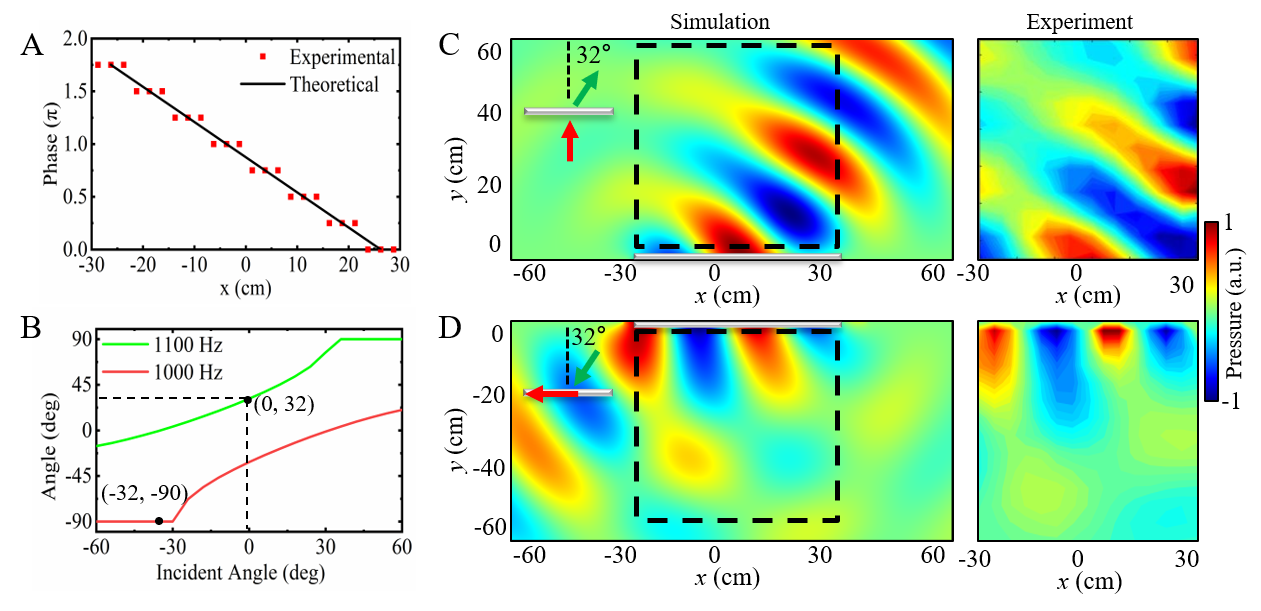 图3 单向倏逝波转换。(A)声学超材料时空调制的初始相位的空间分布。(B)基频1000Hz和谐波1100Hz之间的入射与透射角度关系。(C)正向传播时1000Hz的基波垂直入射,产生的1100Hz谐波在透射侧沿32°折射。(D)反向过程,1100Hz声波产生1000Hz且沿表面传播的倏逝波。
