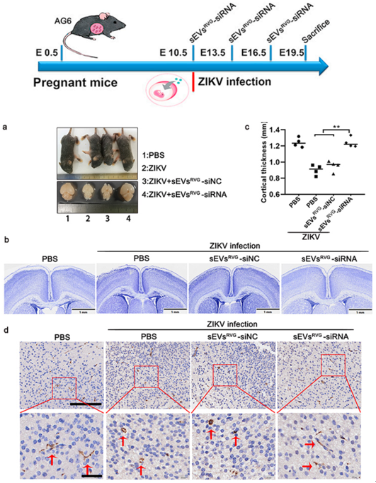 图5:sEVsRVG-siRNA保护胎鼠免受ZIKV感染并`缓解ZIKV引起神经炎症和的神经系统损伤