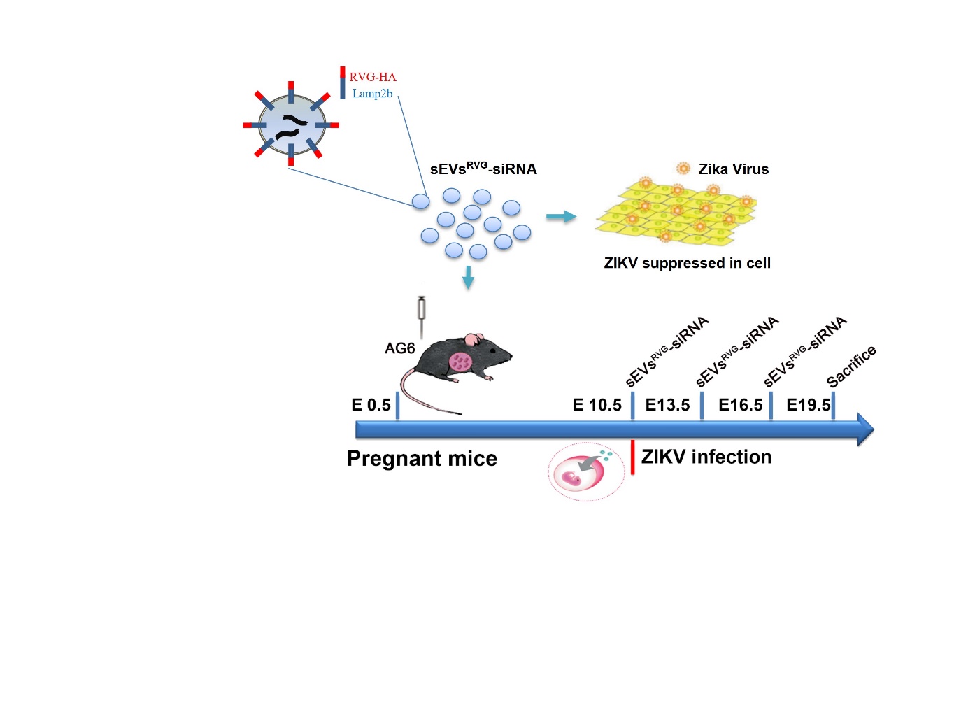 为了开发一种能够穿越胎盘和血脑屏障的特异性抗病毒疗法来治疗ZIKV引起的小头症,我们设计了靶向脑部神经的细胞外小囊泡(sEVsRVG)并装载抗病毒siRNA(ZIKV特异性siRNA)来抑制ZIKV。细胞外小囊泡(sEVsRVG)的脑部神经特异性靶向是通过将sEVs膜蛋白lamp2b和神经靶向性的狂犬病毒糖蛋白衍生肽(RVG)融合递呈在细胞外囊泡上,在细胞及动物水平验证了sEVsRVG-siRNA的抗病毒能力