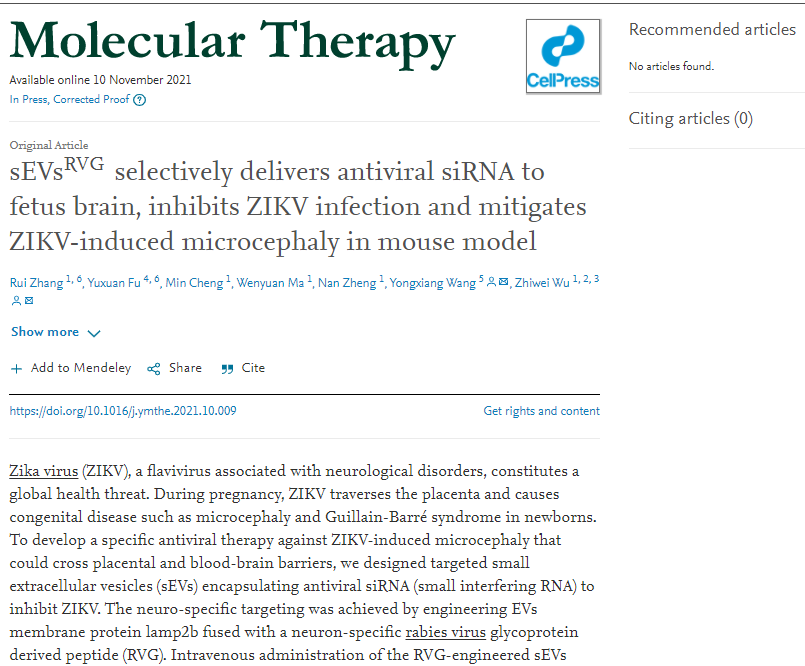 3.Zou, X., Yuan, M., Zhang, T., Zheng, N., and Wu, Z. (2021). EVs Containing Host Restriction Factor IFITM3 Inhibited ZIKV Infection of Fetuses in Pregnant Mice through Trans-placenta Delivery. Mol Ther 29, 176-190. 10.1016/j.ymthe.2020.09.026.