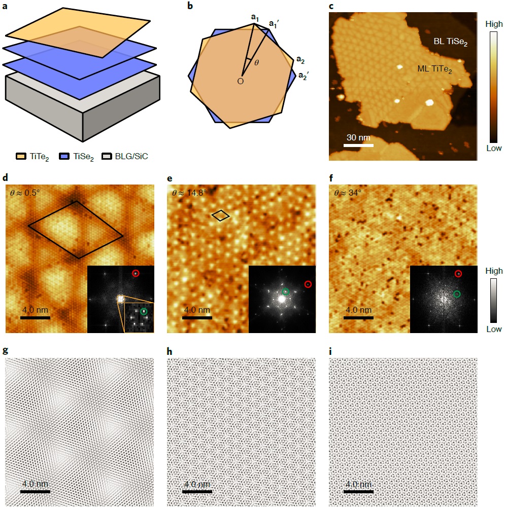图1:1T-TiTe2/1T-TiSe2莫尔图案的转角演化。(a, b) TiTe2/TiSe2转角异质结示意图;(c) STM形貌图;(d-f) 不同转角下的高分辨STM形貌图;(g-i) 对应的刚性晶格莫尔图案示意图。