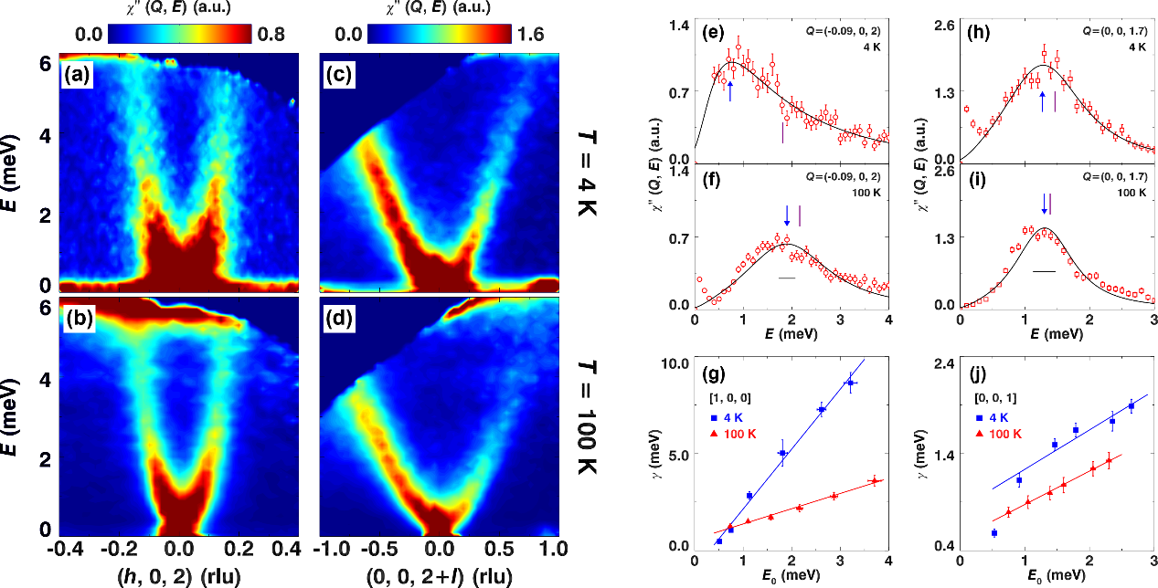 图2. (a)、(b)和(c)、(d) 面内和面外方向4 K以及100 K的低能自旋波激发。(e)-(g)和(h)-(j) 面内和面外方向两个温度下的等动量切线以及阻尼常数比较。