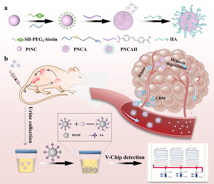 超小的铂纳米簇(PtNCs)作为一种优异的外源性试剂由于其出色的酶模拟活性以及其超小的尺寸效应受到了广泛的关注。基于此,宋玉君课题组构建了一种基于铂超纳米粒子乏氧响应性的纳米传感器用于肿瘤的尿液微流控监测,该纳米传感器能够在肿瘤微环境中典型乏氧特征下响应并解离释放出许多超小的PtNCs作为外源性标志物代谢到尿液中,从而进行疾病状态的监测。超小的PtNCs用乏氧敏感的偶氮苯键组装成一个大的铂超纳米粒子以实现肿瘤部位的乏氧响应。由于这些释放的PtNCs的粒径小于肾脏可清除的临界值(~5.5 nm),因此可以经由肾脏代谢到尿液中,通过对尿液中的PtNCs的浓度进行芯片检测,可以进行疾病状态的读出。这种肿瘤微环境响应的纳米传感器一方面克服了内源性生物标志物不足的缺陷,能够提高肿瘤检测的灵敏度,另一方面通过芯片进行疾病状态的检测,是一种简单通用的检测手段,成本低廉,可以大大降低检测的繁琐程序和成本。