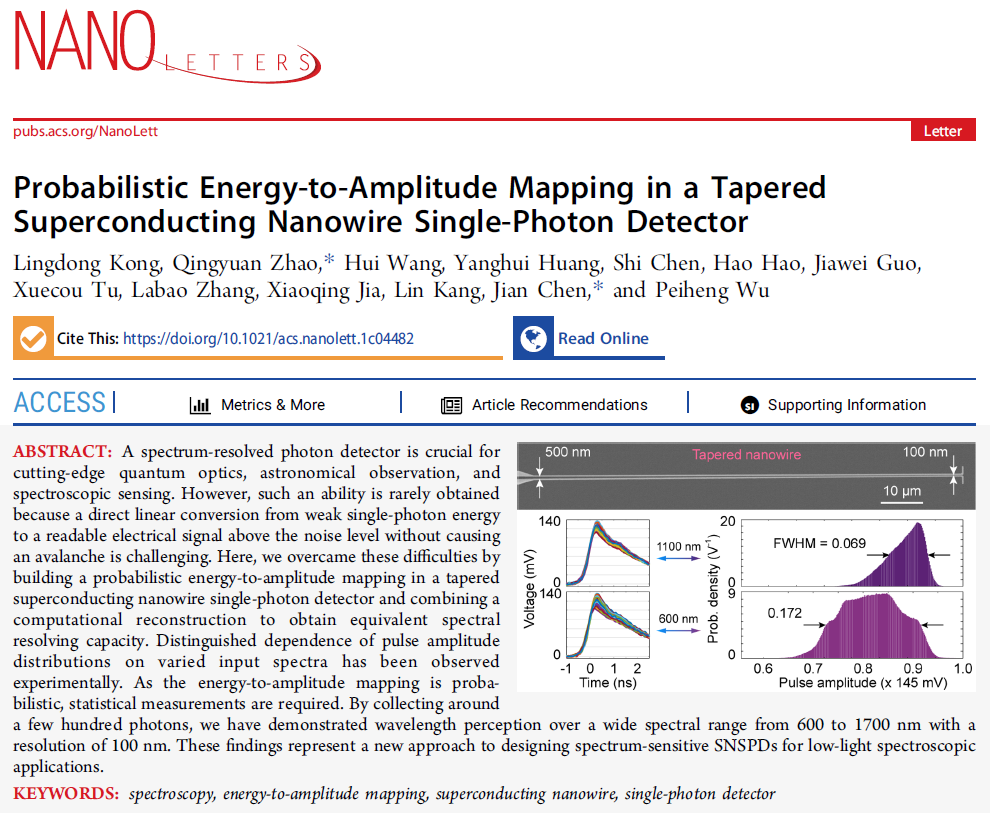 相关研究工作以"Probabilistic energy-to-amplitude mapping in a tapered superconducting nanowire single-photon detector"为题发表在《Nano Letters》上[https://pubs.acs.org/doi/10.1021/acs.nanolett.1c04482]。审稿人指出我们的方法巧妙地将光谱和幅度联系起来"… used a series of tricks to link the input photon spectrum to output pulse amplitude"。并认为我们的结果不光实现了光谱感知功能,同时也可以作为一个很有价值的平台去研究超导纳米线的一些光探测机理,为新型器件的研发奠定基础"The device architecture may serve as a valuable testbed for the fundamental studies of nanowire detectors and may lead to other novel devices."。