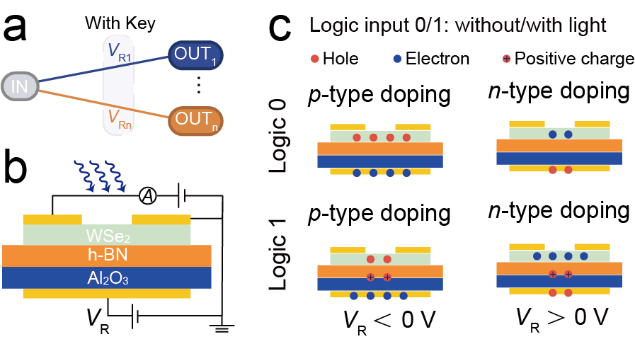 图a: 有密钥的安全电路原理图;图b: 光电晶体管的示意图;图c: 信息加密的物理机制。 定义黑暗和光照(波长405nm,持续时间100ms)分别为输入逻辑“0”和“1”。 一方面通过控制逻辑输入,实现调控h-BN/Al2O3界面处屏蔽电场的大小,另一方面通过改变栅极电压的大小和极性来改变栅极电场。这两个电场的协同作用实现了对沟道载流子浓度和类型的调控,最终影响了源漏电流。