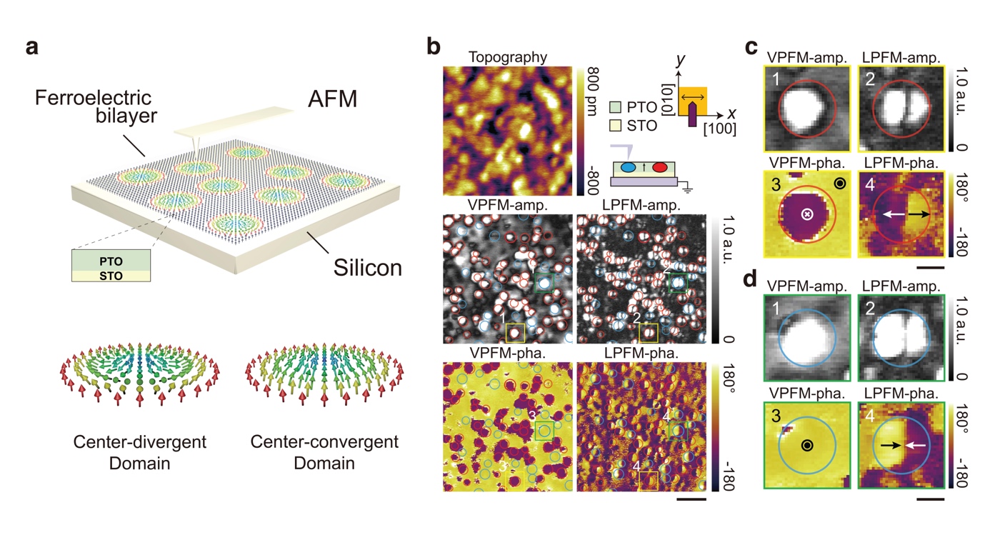 图1 PTO20/STO10双层膜中高密度铁电纳米畴的实现。(a)自支撑双层膜中铁电纳米畴示意图。(b)自支撑双层膜的AFM形貌、VPFM振幅、VPFM相位、LPFM振幅和LPFM相位图。(c)中心发散和(d)中心会聚型纳米畴的放大图。