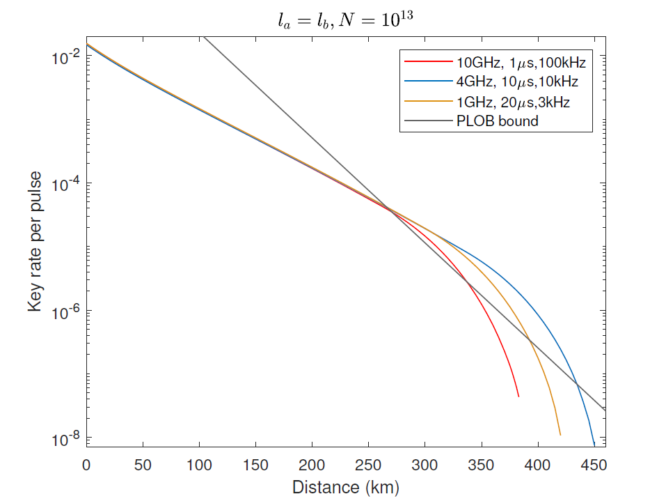 仿真结果表明,对于1 GHz系统,该协议在无相位跟踪的情况下传输距离可达450 km;同时去除相位跟踪和相位锁定技术后,该协议在有限密钥效应下可以在270公里的距离上打破无中继量子信道码率-距离限制。在城际距离,该协议的密钥率与原始MDIQKD协议相比提高了数万倍。例如,传输300公里其密钥率可达0.15 Mbit/s,足以执行包括音频和视频一次一密等各种任务。与此同时,由于该协议无需相位跟踪,其单光子探测器的所有探测计数容量都可以用于量子信号测量,使其在城际距离上能实现比使用同频强参考光相位跟踪技术的TFQKD协议高一个数量级的密钥率。