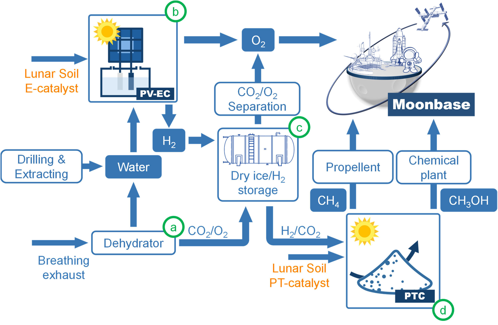 研究团队进而采用月壤作为光伏电解水、光催化水分解、光催化CO2还原、以及光热催化CO2加氢等反应的催化材料,评估其性能。研究表明,月壤在光伏电解水和光热催化CO2加氢反应中具有较高的性能和选择性。基于以上分析,研究团队针对月球环境,提出利用月壤实现地外人工光合成的可行策略与步骤。即利用月球夜间的极低温度(-173°C),通过凝结将二氧化碳从人类呼吸空气中直接分离。然后嫦娥五号月壤作为水分解的电催化剂和CO2加氢的光热催化剂,将呼吸废气、月球表面开采的水资源等转化为O2、H2、CH4和CH3OH。这项工作为建立适应月球极端环境的原位资源利用系统提供了潜在方案,并且只需要月球上的太阳能、水和月壤。基于该系统,人类或可实现“零能耗”的地外生命保障系统,真正支持月球探测、研究和旅行。