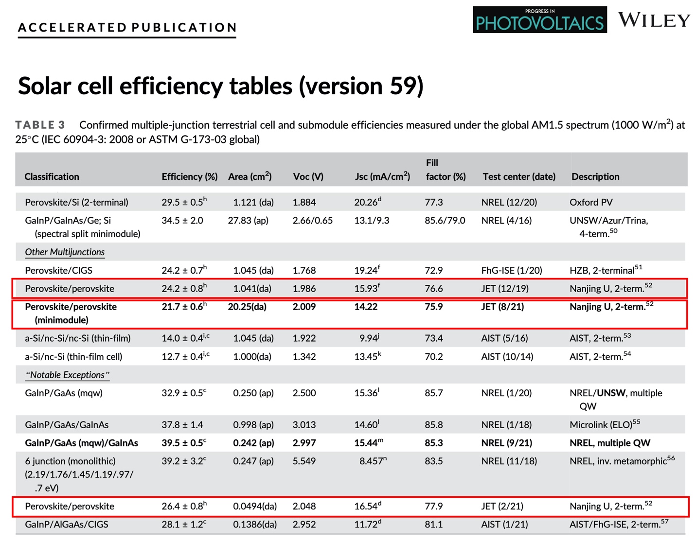 图3 叠层太阳能电池世界纪录效率表(Version 59)