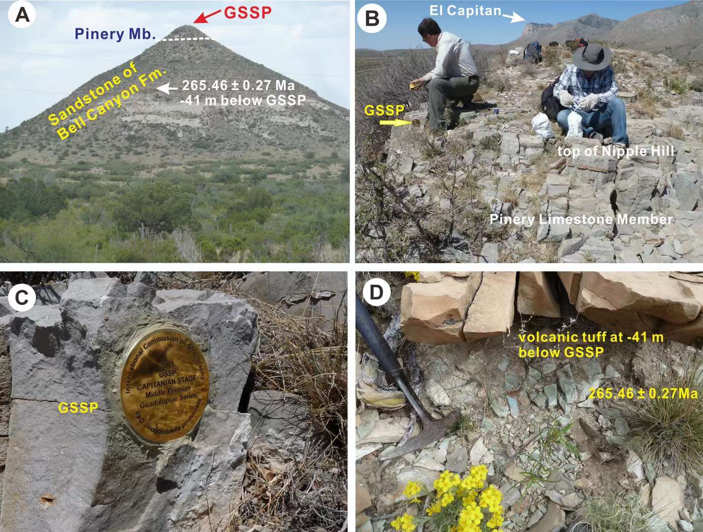 卡匹敦阶“金钉子”位于美国瓜达鲁普山地区Nipple Hill剖面,该剖面卡匹敦阶底界之上仅出露0.5 m地层,难以进行详细的长尺度生物地层学等的研究。为了解决这一难于克服的自然条件问题,研究团队在距离该剖面以西约2.9 km找到了新的含有这一界线的Frijole剖面,该剖面连续出露了从沃德阶中部至卡匹敦阶上部的地层,研究团队对该辅助层型剖面也进行了深入细致的研究。系统的CA-ID-TIMS高精度锆石U-Pb年代学研究卡定卡匹敦阶底界年龄被为264.28 ± 0.16 Ma,磁性地层学对比结果表明伊拉瓦拉反转(Illawarra Reversal) 位于卡匹敦阶底界稍下方层位,锶同位素化学地层学研究显示87Sr/ 86Sr比值在整个卡匹敦阶持续下降。无机碳同位素结果显示在沃德阶-卡匹敦阶之交没有明显的碳同位素漂移;综合对比表明,卡匹敦阶相当于特提斯地区以?类生物地层为基础建立的Midian阶的中上部。