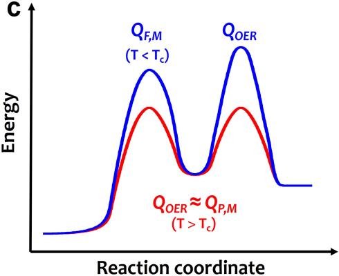 图4. 热-电耦合的物理基础 (a) 低自旋Fe3+通过增加电子转移途径显著提升了OER的质子耦合的电子传输过程。(b) 顺磁态Fe3+符合高效OER的Sabatier催化原理。(c)热致磁相变使得热作为控制材料电子态的重要参量,有效参与电子化学势改变和降低电子转移势垒。