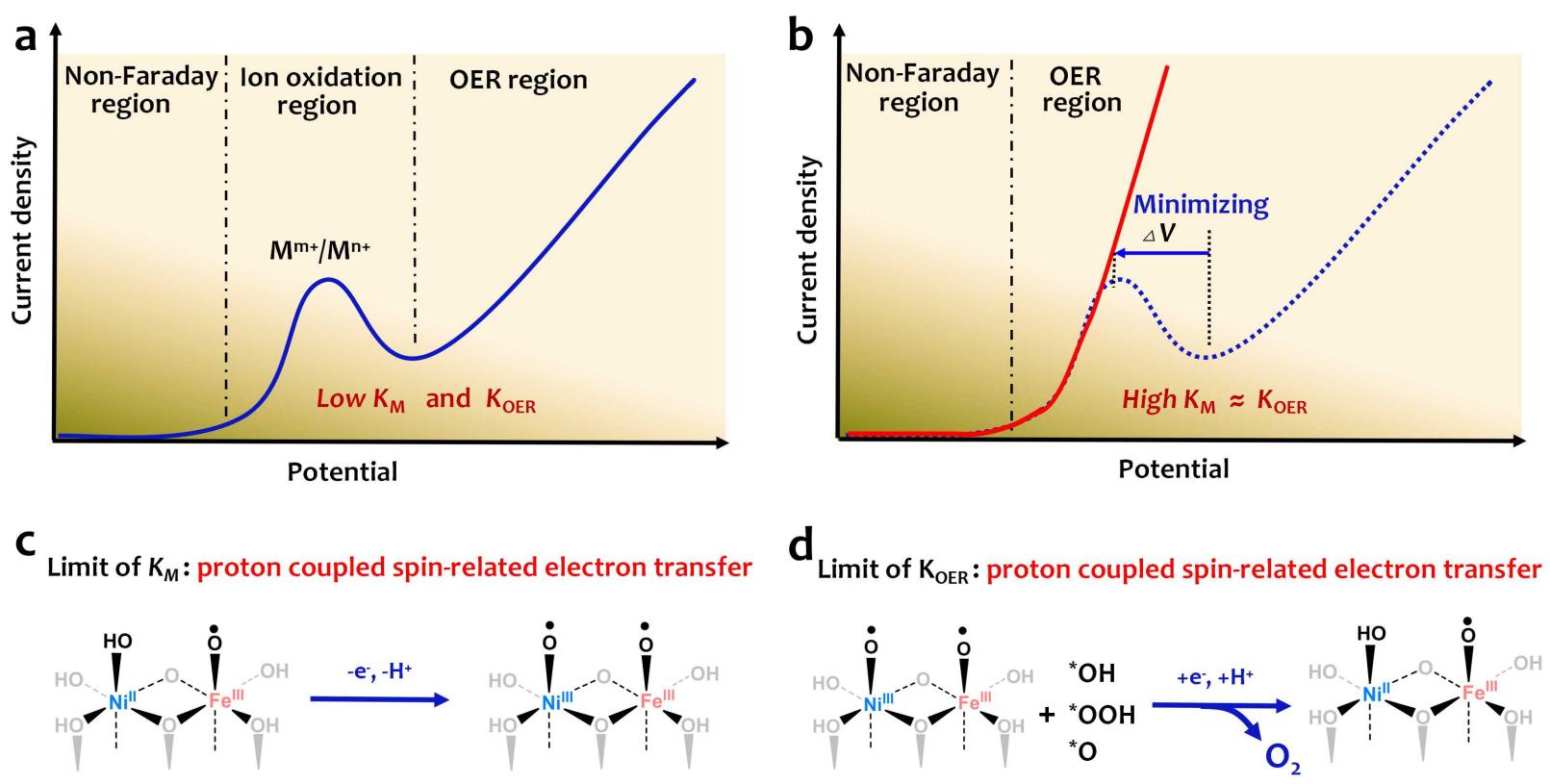 图1(a-b)实际和理想情况下以氧化还原电对为媒介的OER电催化剂上的电流-电压极化曲线,其中KM表示氧化还原电对的氧化速率常数,KOER表示OER速率常数,(c-d)镍铁基磁性OER电催化剂的KM和KOER动力学受限起源示意图,二者动力学受到质子耦合自旋相关电子转移(Proton-coupled spin-related electron transfer, PCSRET)的势垒限制。