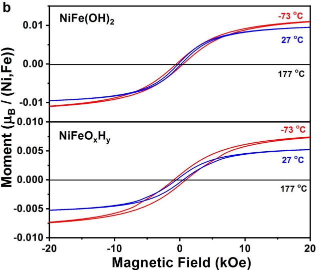 图2. (a)外加磁场强度H为500 Oe下,NiFe(OH)2和NiFeOxHy的零场冷却(ZFC)和场冷(FC)磁化强度随温度的变化函数,(b)不同温度下的M-H磁滞回线。